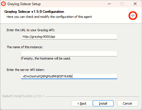- Provide the URL your Graylog server's API endpoint and API token during installation