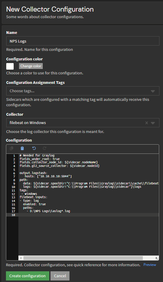 - Enter a Name, choose the "filebeat on Windows" Collector, and input the configuration text below.