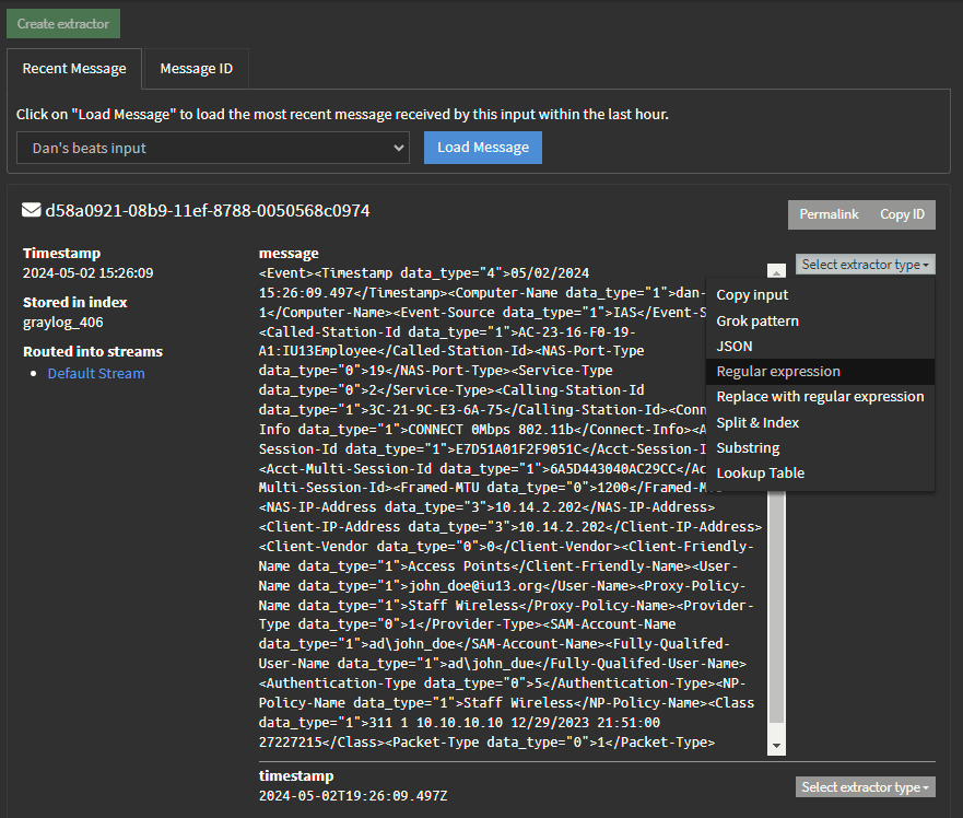 - Click Load Message to load a recent message from the input. This message will be used to test your new extractor