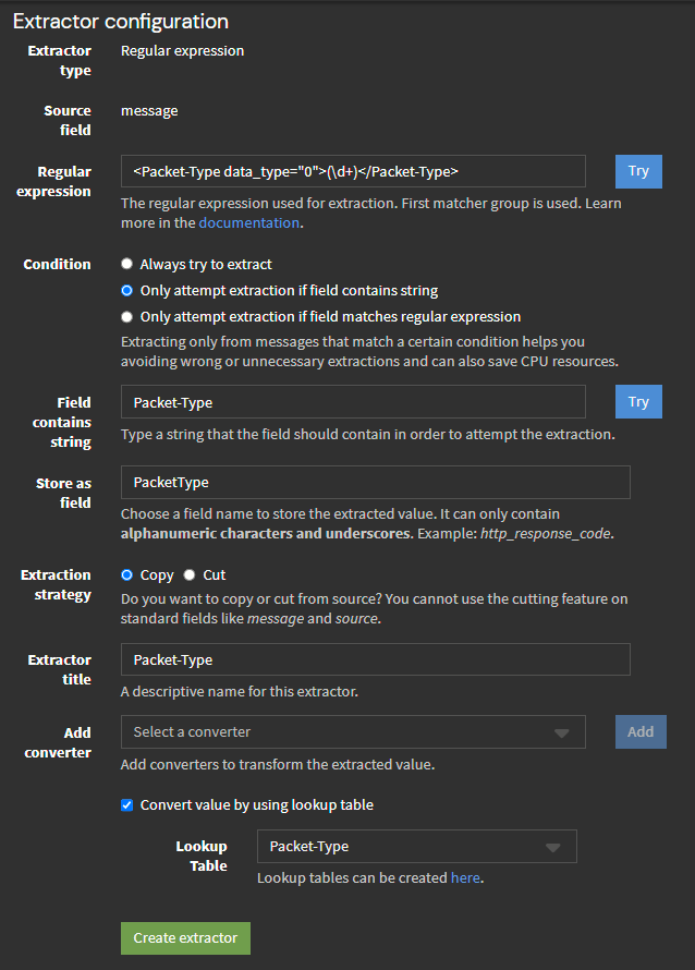 Packet-Typein the Extractor title textbox - Next to Add converter, select "Lookup Table" and click the Add button