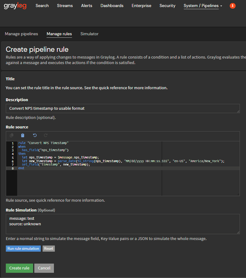 rule "Convert NPS Timestamp" when has_field("nps_timestamp") then let nps_timestamp = $message.nps_timestamp; let new_timestamp = parse_date(to_string(nps_timestamp), "MM/dd/yyyy HH:mm:ss.SSS", "en-US", "America/New_York"); set_field("timestamp", new_timestamp); end - Click Create Rule