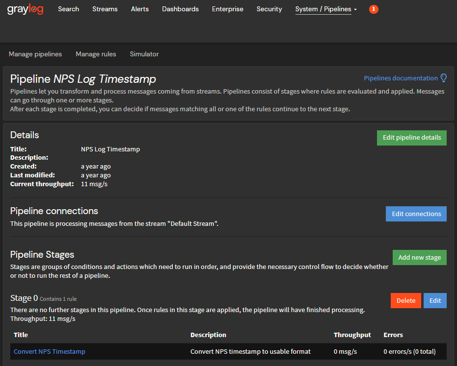 We can fix that by using a pipeline rule to parse the NPS timestamp within the log message, and replace the timestamp Graylog recorded when the message was received at the input.