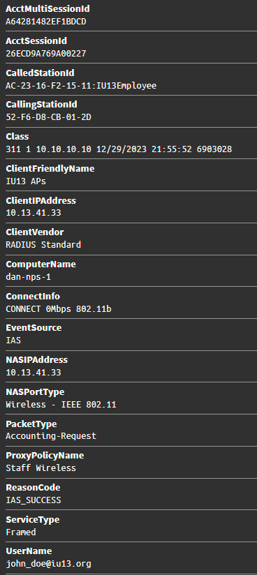 EAP-Friendly-NameEvent-SourceFramed-IP-AddressFramed-MTUFully-Qualifed-User-NameNAS-IP-AddressNAS-IPv6-AddressNAS-Port-TypeNP-Policy-NameTimestampPacket-TypeProvider-TypeProxy-Policy-NameQuarantine-Update-Non-CompliantReason-CodeSAM-Account-NameService-TypeSession-TimeoutUser-Name