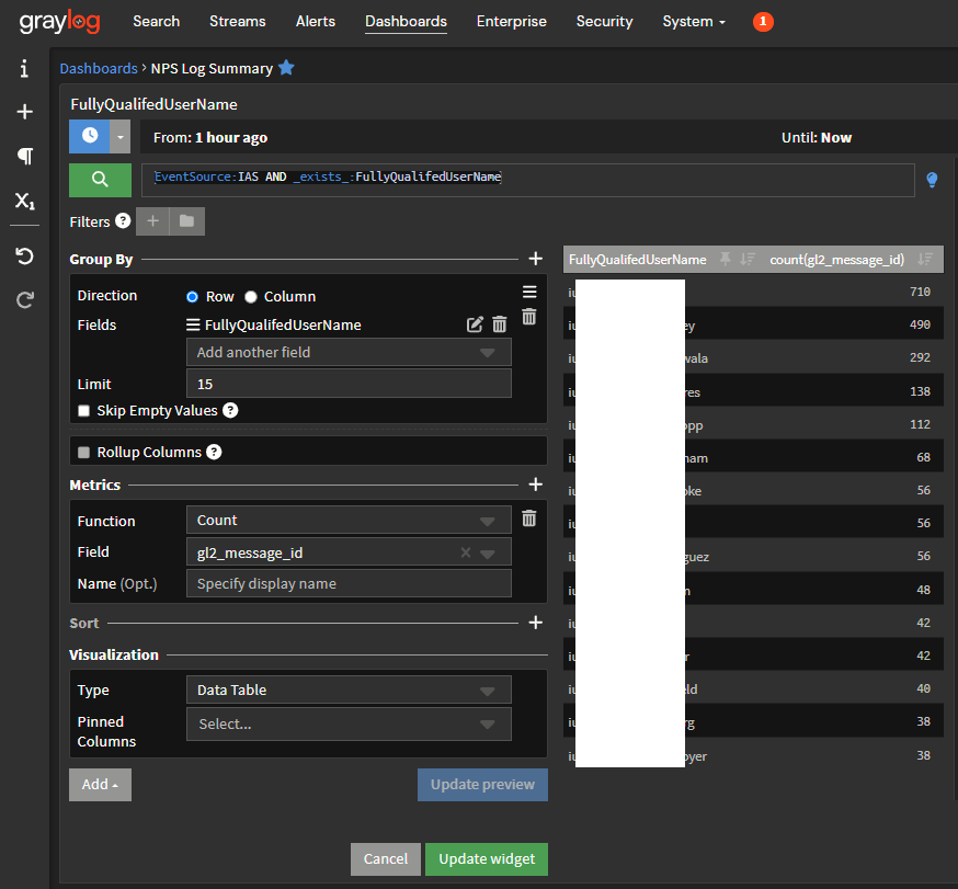 In this example, we'll aggregate the top n values of FullyQualifedUserName